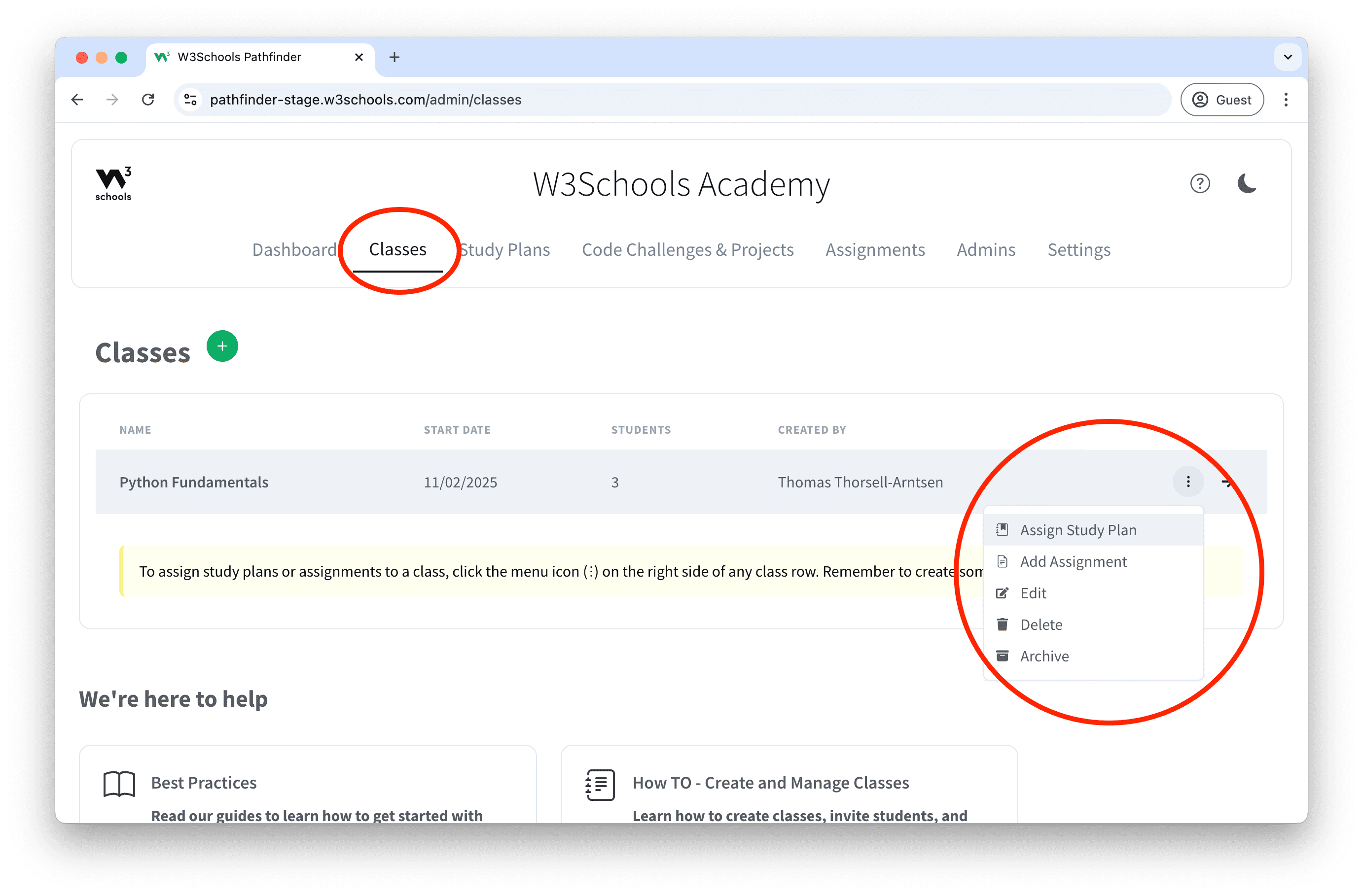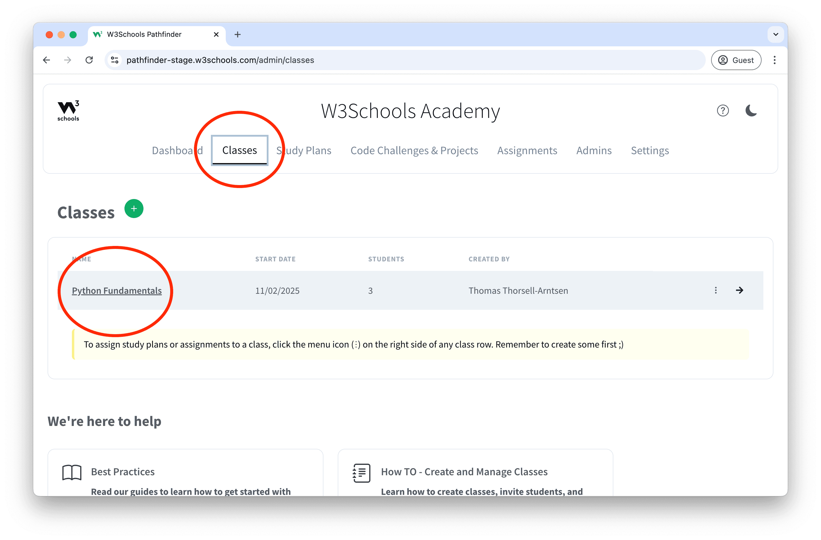1. Navigate to the Classes page in the top navigation menu.