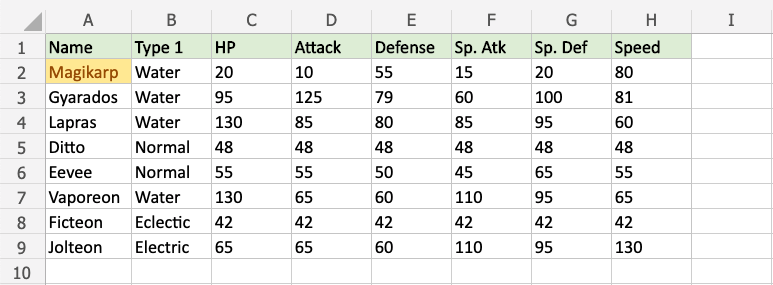 Now, the cells with text values equal to "Magikarp" will be highlighted in yellow: