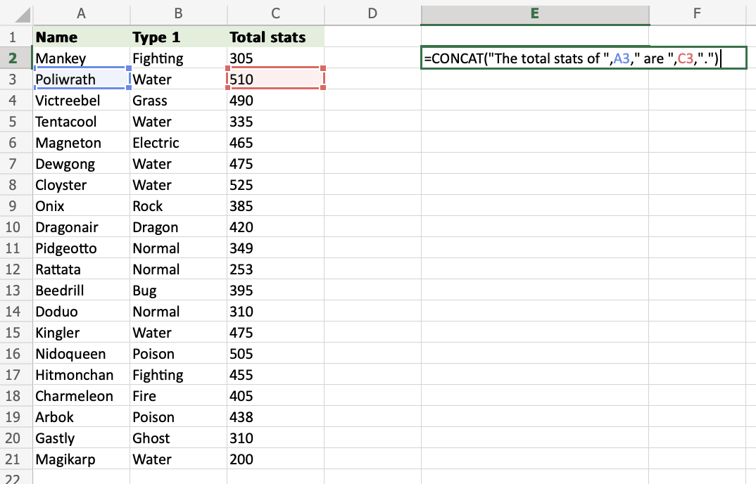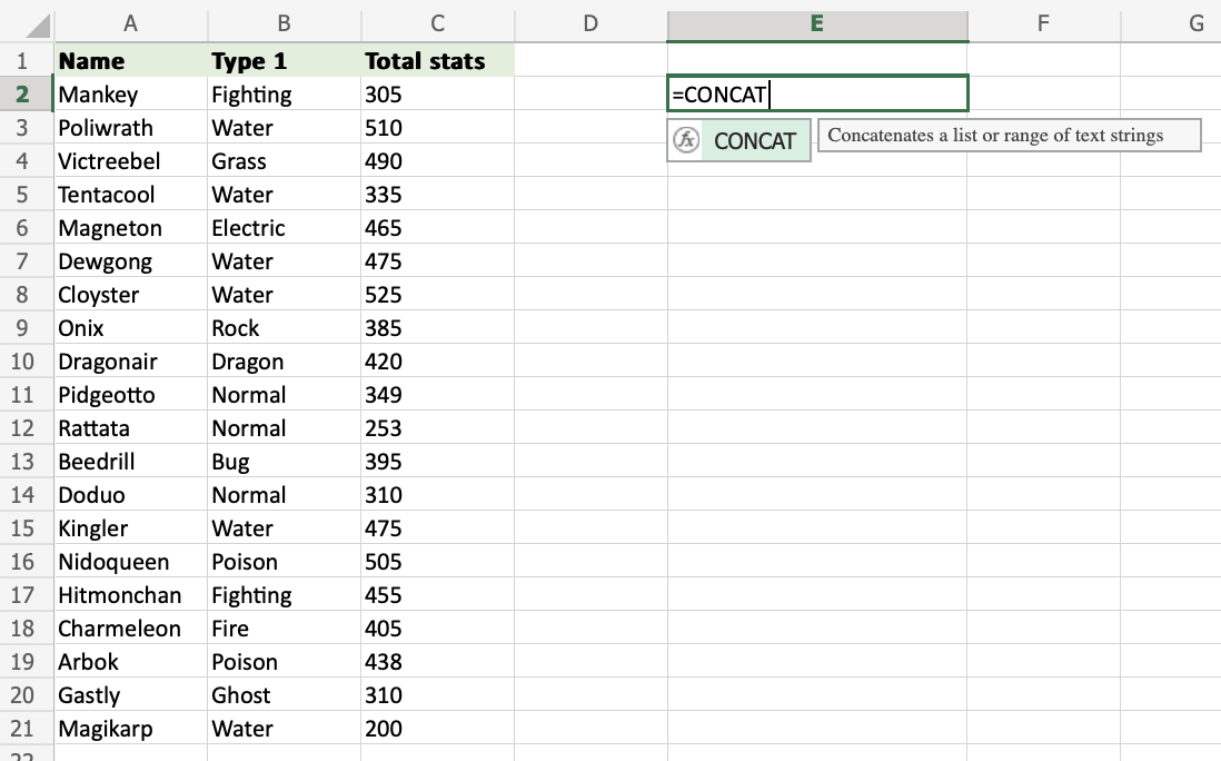 Note: The CONCAT function does not provide any delimiters between cell values used