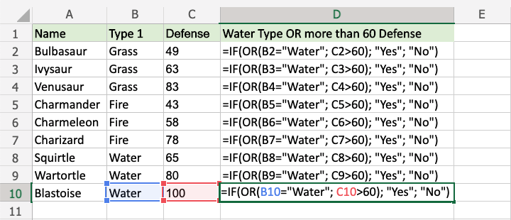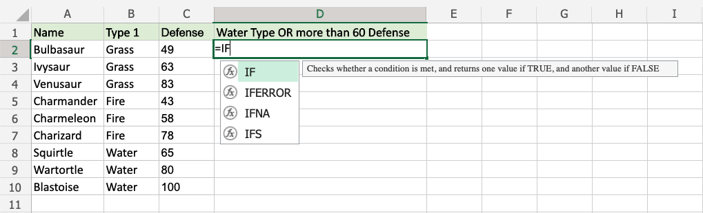 - Wartortle is both Water type and has more than 60 defense, so the function returns "TRUE"