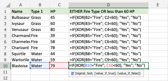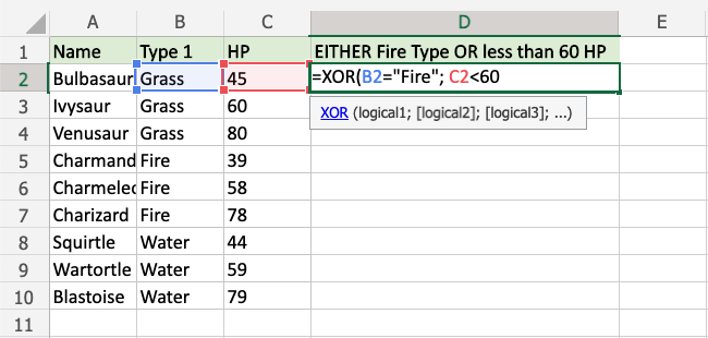 Now, each row has a check for Fire Type or HP less than 60, but not both: