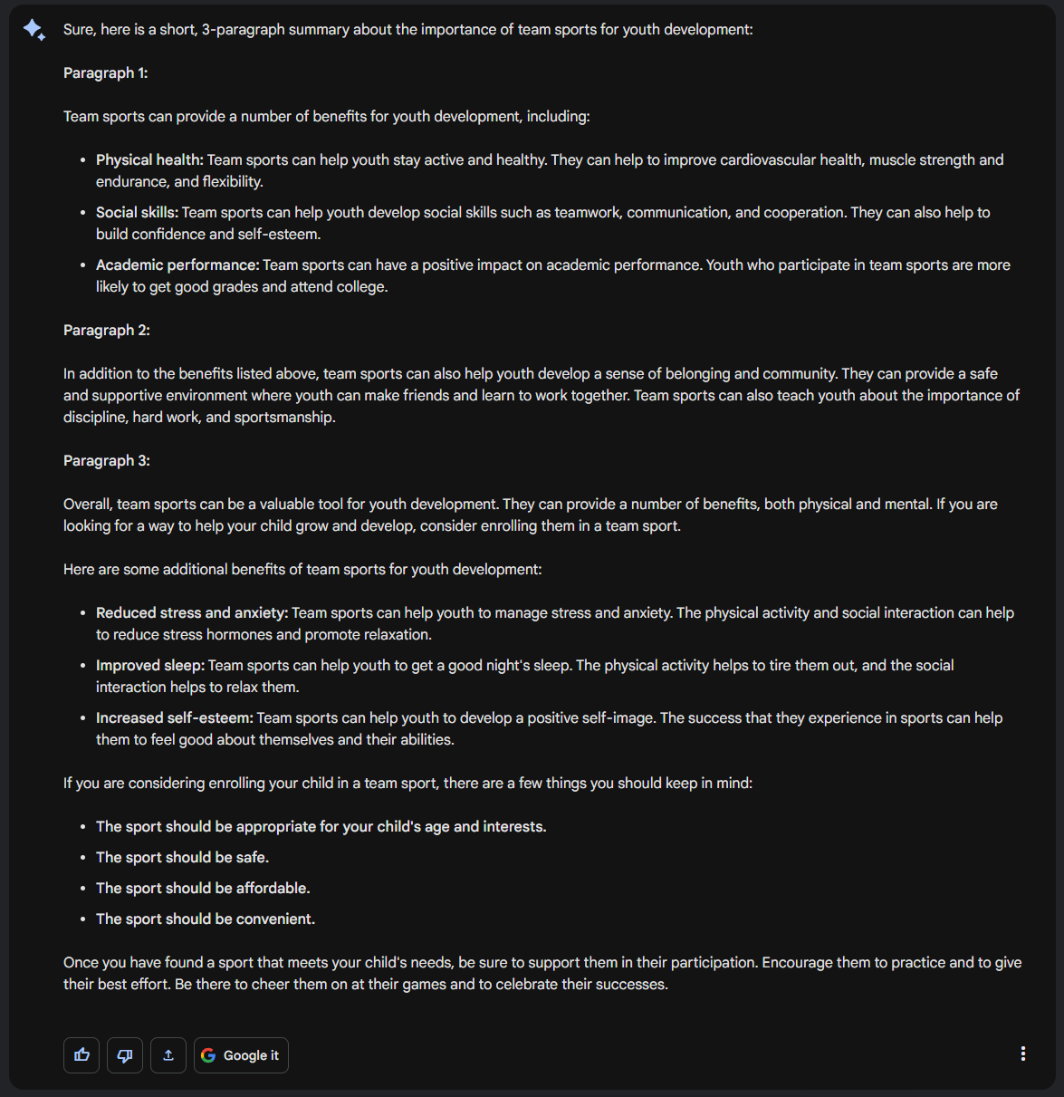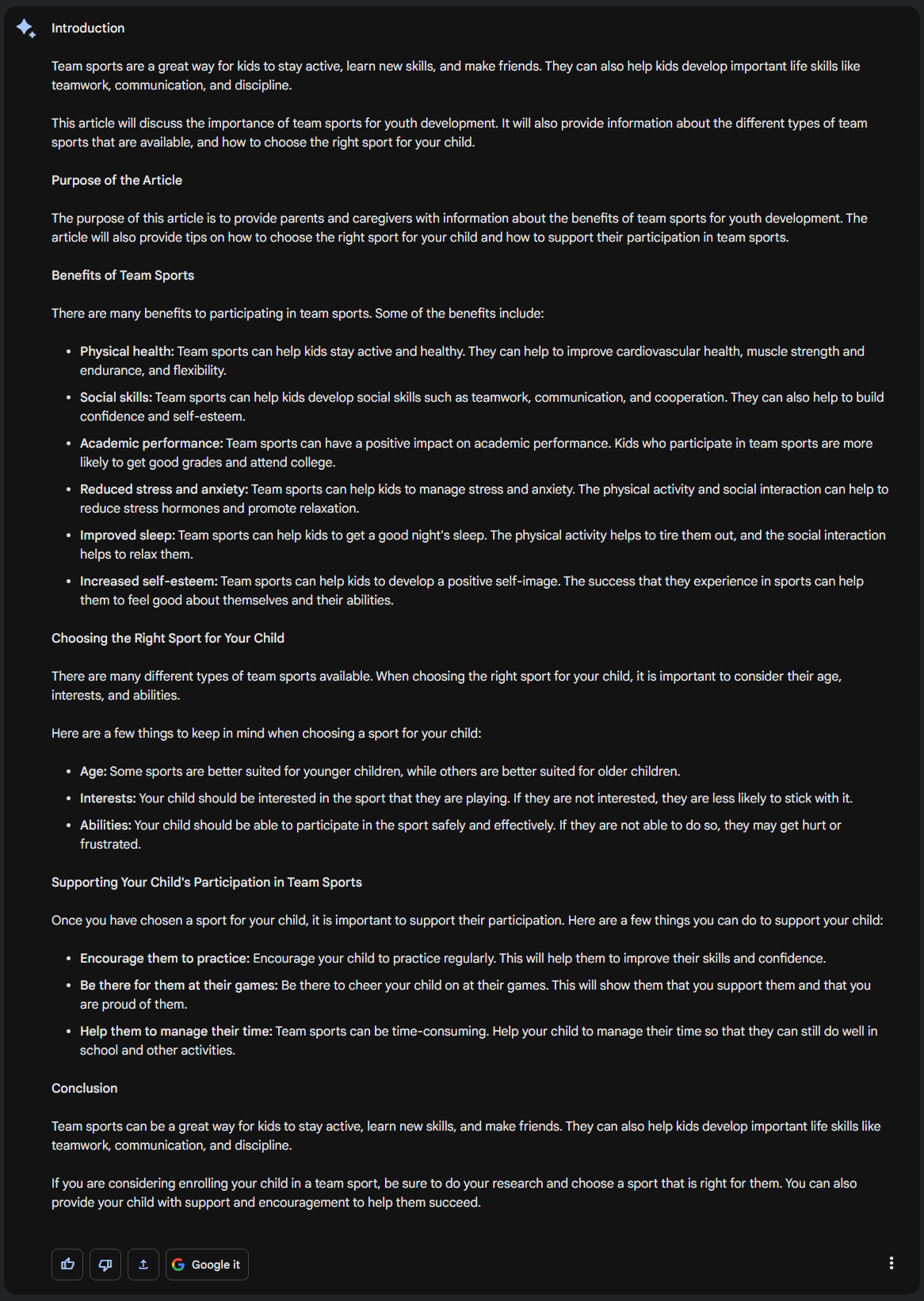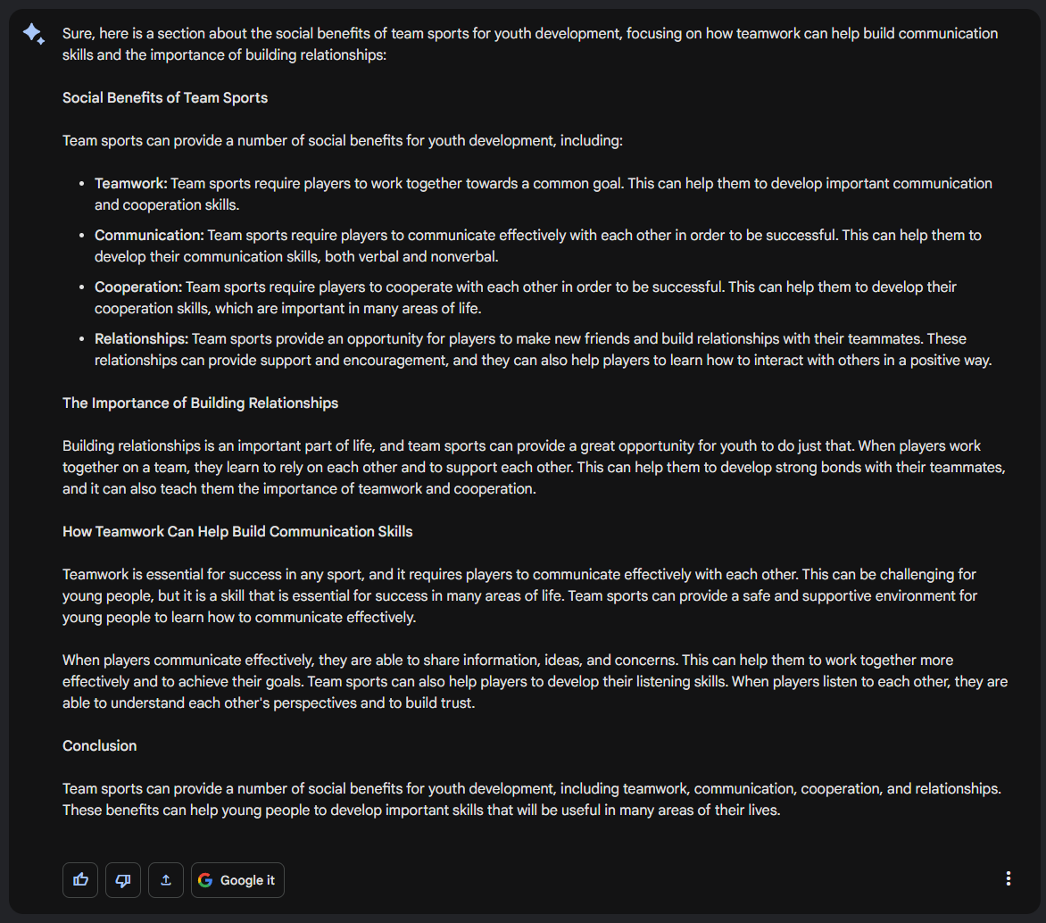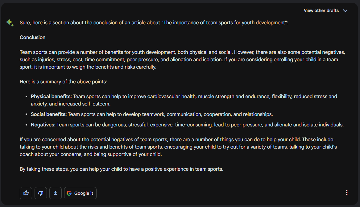 Now you have a good starting point, a first draft you can use to start writing further. Adding examples and sources for these claims would be the next natural step. But you have used Bard as a tool to help you get started.