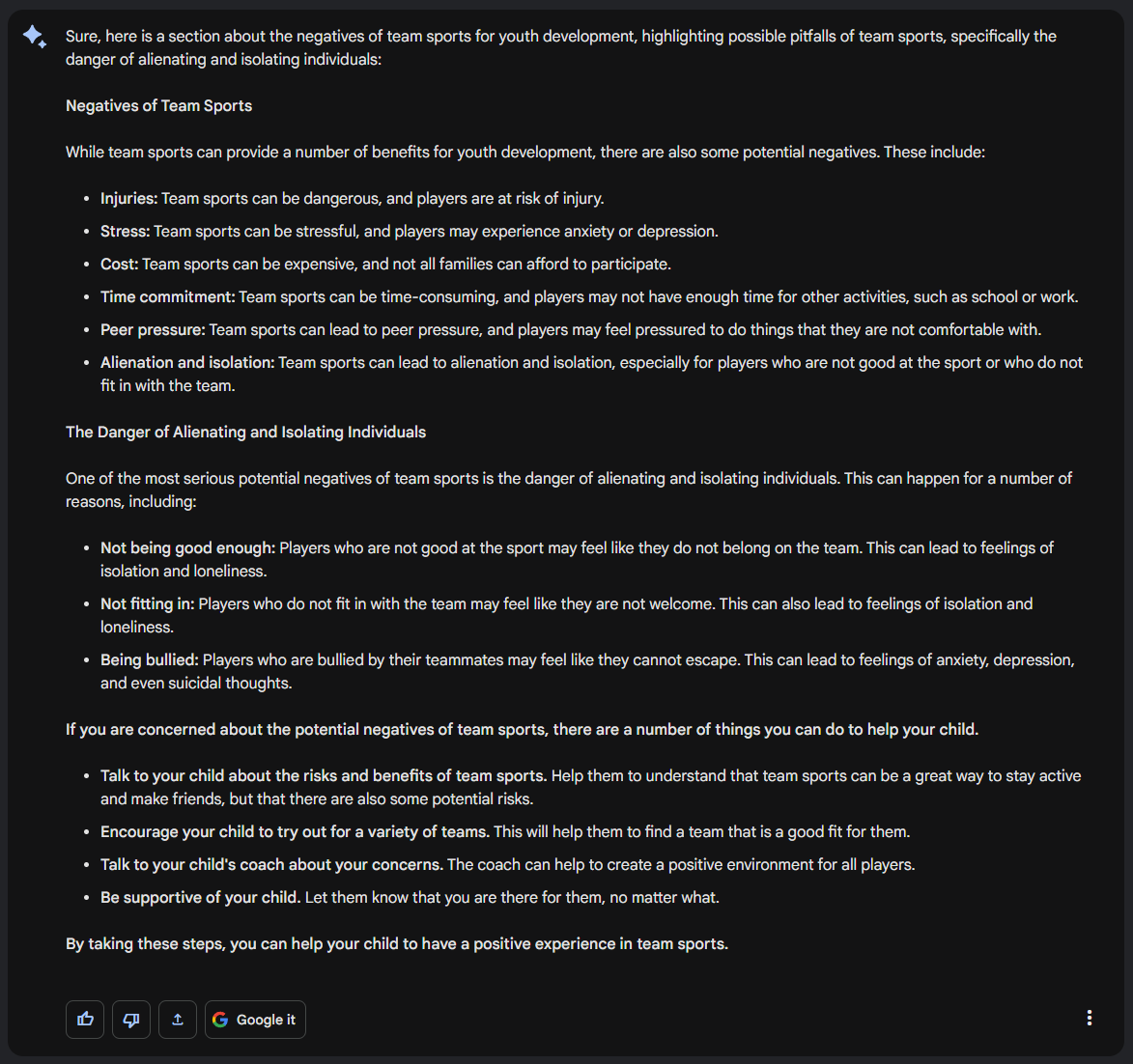 For an article about "The importance of team sports for youth development", write a section about "Negatives of Team Sports - Highlighting possible pitfalls of Team Sports, specifically the danger of alienating and isolating individuals":
