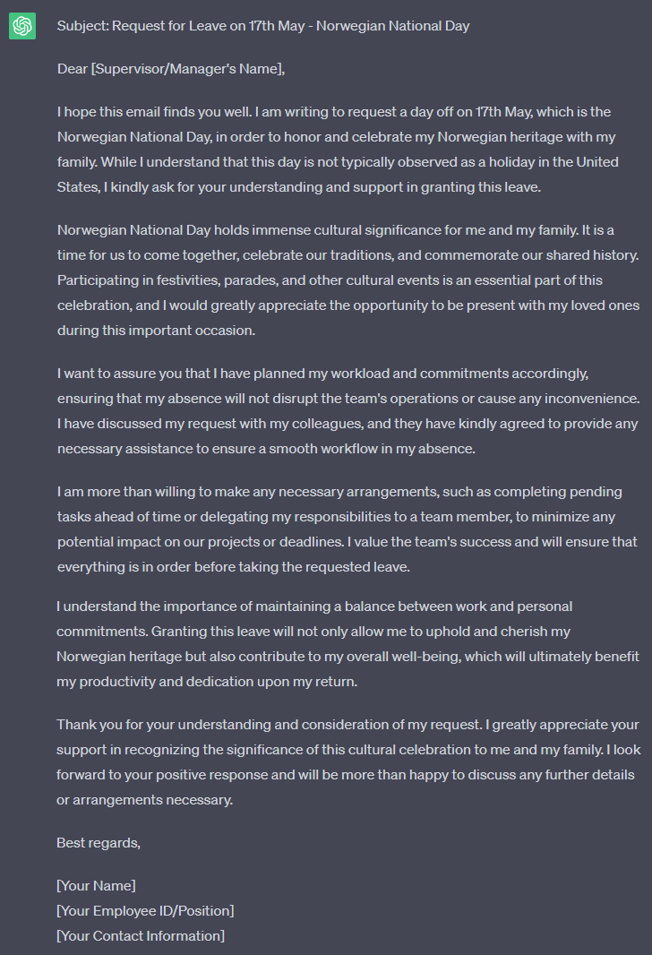 In this example, we want to ask for the day off on the 17th of May to celebrate Norway's national day.