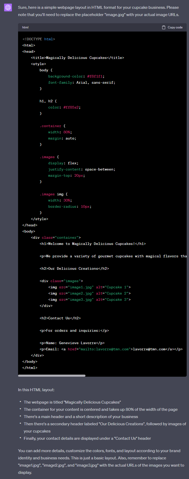 Create a simple webpage with my cupcake business name, "Magically Delicious", a short description, a few images, and my contact details (Genevieve Lavorre, Email: [email protected])