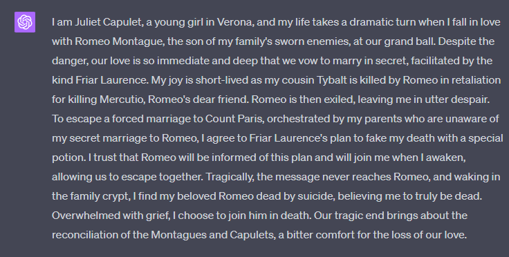 The previous example provided a basic summary of "Romeo and Juliet", but let's try and ask a few different ways: