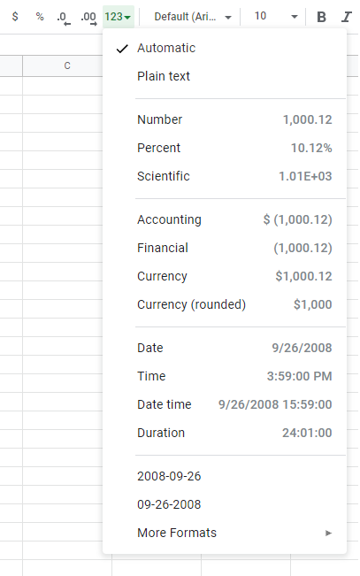 Pro tip: The rectangle in the top left corner by row 1 and column A can be clicked to select all cells in the sheet. This can be useful if you want to change the Number format or change Decimals for all cells.