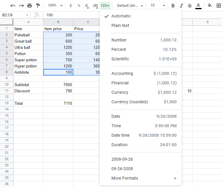 In the example we have cells that represent prices, which can be formatted as Currency.