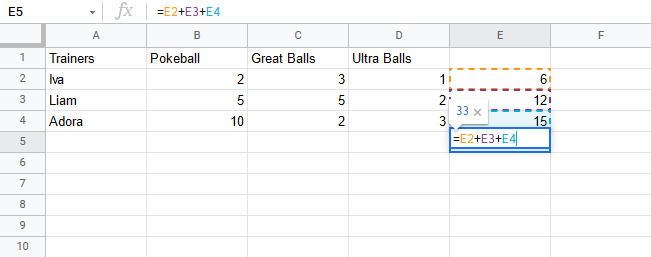 Now we have counted the Pokeballs for all the trainers; Iva(6), Liam(12) and Adora(15).