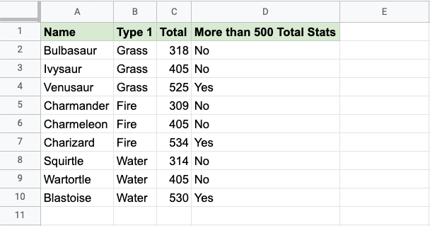 The function can be repeated with the filling function for each row to perform the same check for each Pokemon: