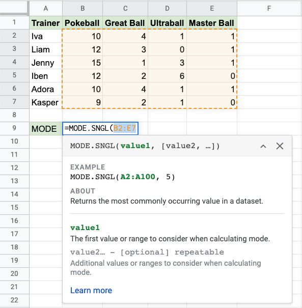 The MODE function is a premade function in Google Sheets, which is used to find the most common value(s).