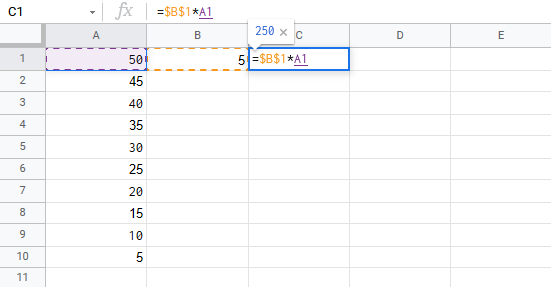 Let's have a look at an example where we multiply B1(5) with the range A1:A10 using absolute reference and the fill function.