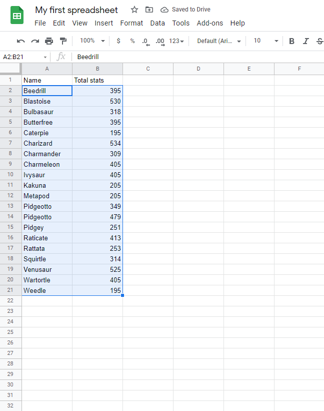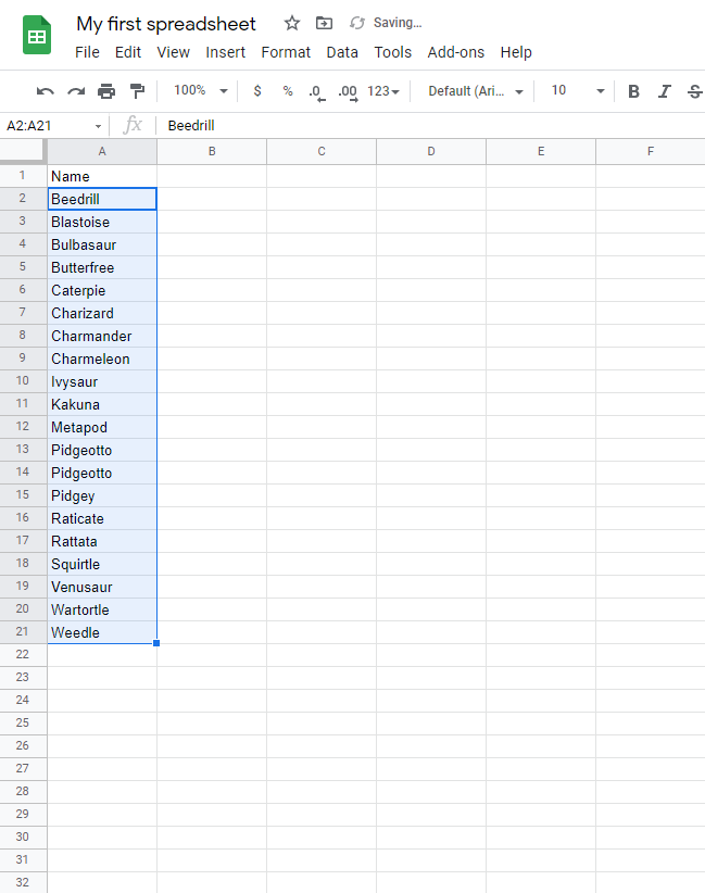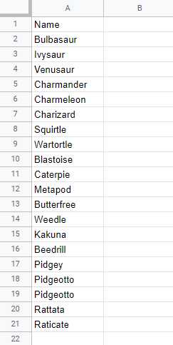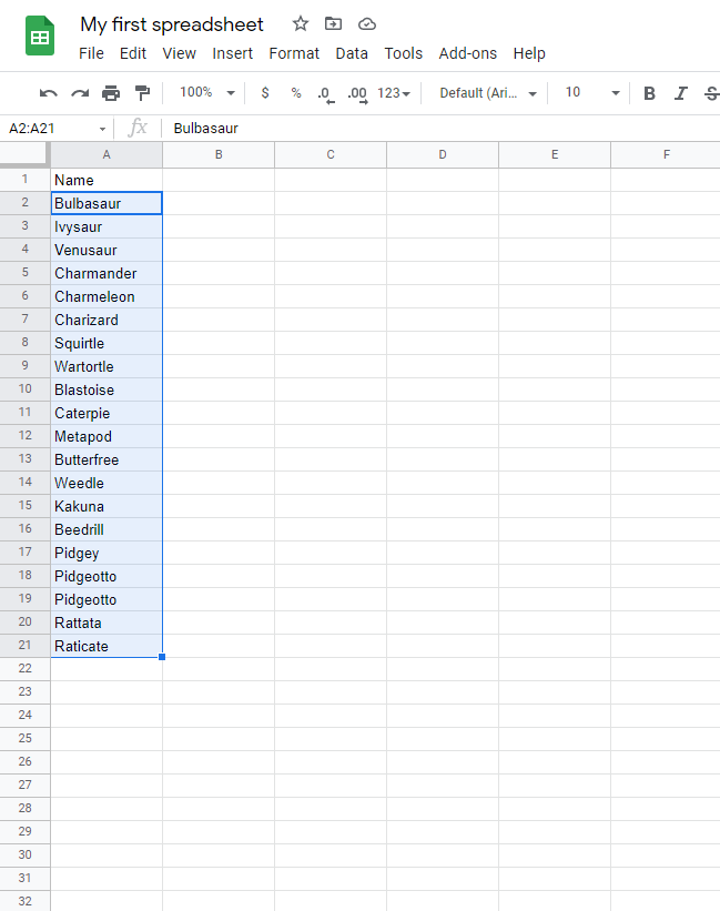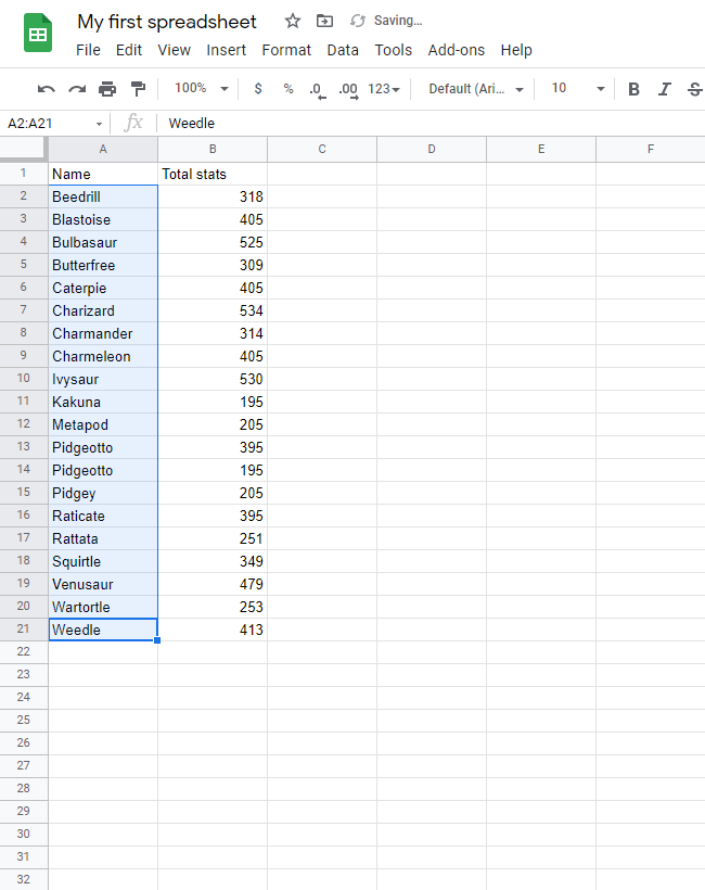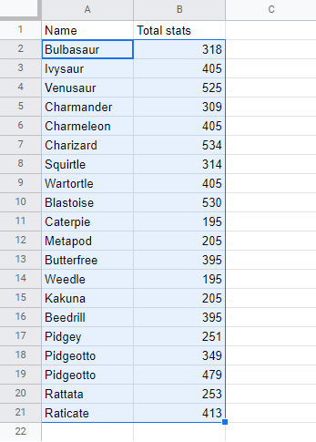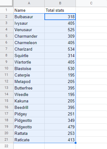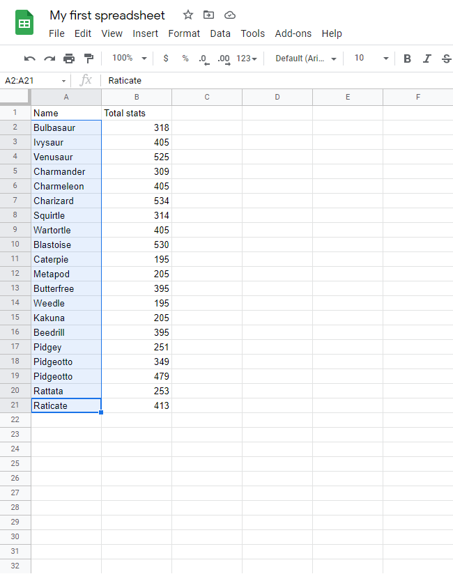 Sort the Pokemon in the range A2:A21 by their Name, ascending from smallest to largest (A-Z).