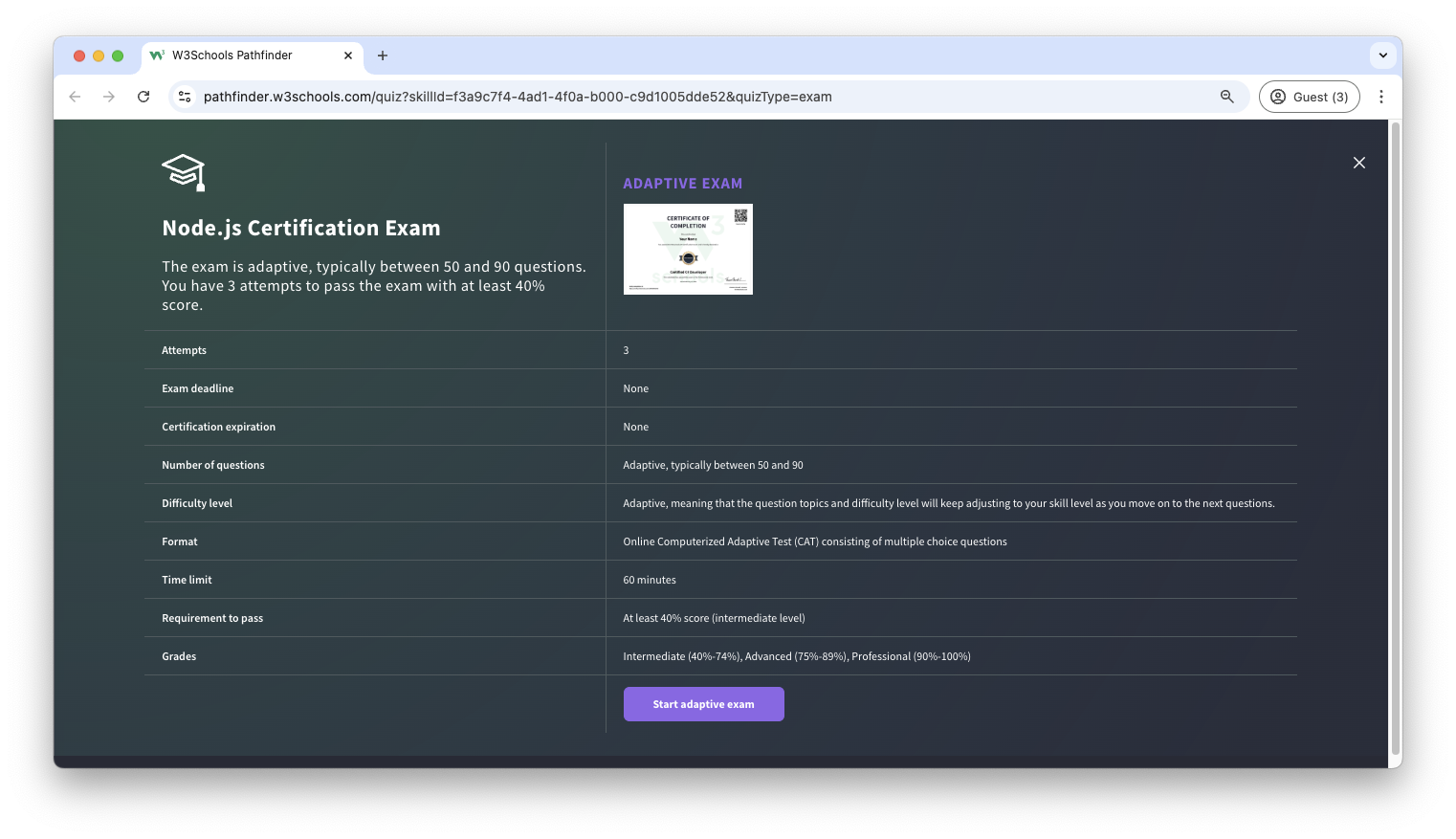 The Node.js exam is a test that summarizes the W3Schools Node.js syllabus.