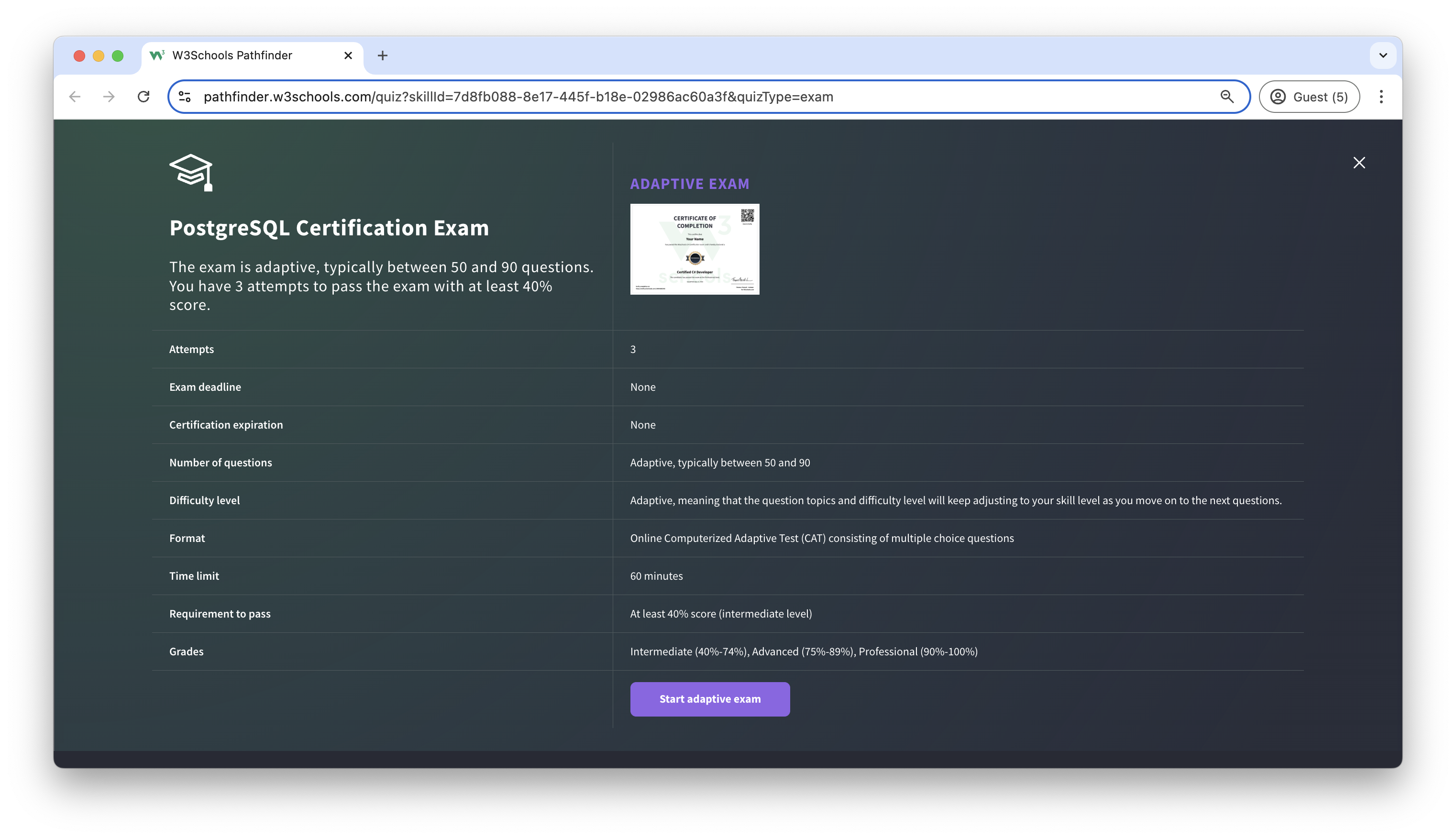 The PostgreSQL exam is a test that summarizes the W3Schools PostgreSQL syllabus.