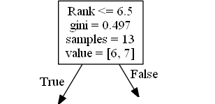 Rank <= 6.5 means that every comedian with a rank of 6.5 or lower will follow the True arrow (to the left), and the rest will follow the False arrow (to the right).