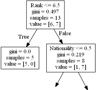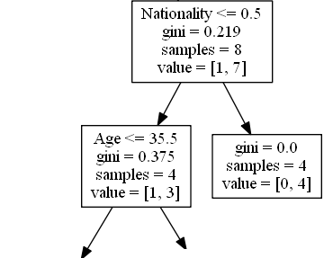 Nationality <= 0.5 means that the comedians with a nationality value of less than 0.5 will follow the arrow to the left (which means everyone from the UK, ), and the rest will follow the arrow to the right.